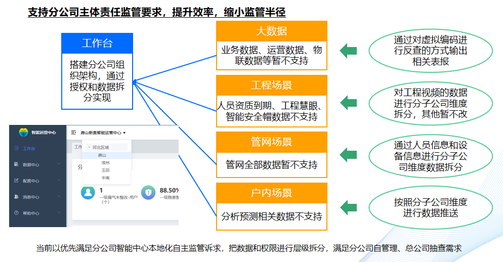 通过搭建分公司组织架构,通过授权和数据拆分实现分公司本地化自主监管,满足分公司自管理、总公司抽查需求。
