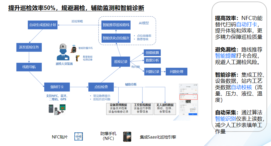 通过引入NFC功能、路线推荐、自动采集、智能诊断等功能,提升巡检效率,规避漏检,辅助监测和智能诊断。