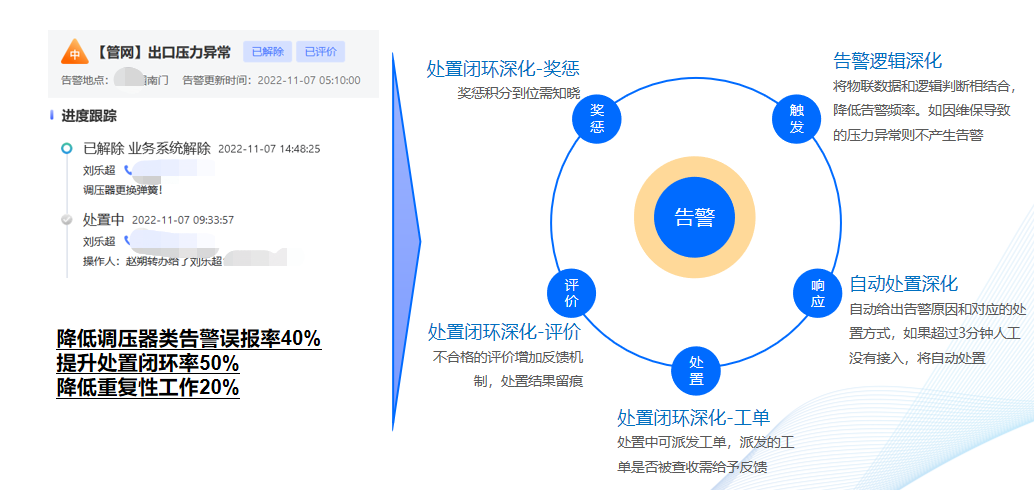 通过深化告警逻辑、自动处置、处置评价和奖惩机制,降低物联类告警误报率,提升处置闭环率,降低重复性工作。