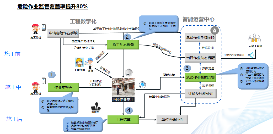 通过完善危险作业手续、施工动态报备、危险作业智能监管、评价及违规处罚等环节,提升危险作业监管覆盖率,规范施工行为,加强考核闭环。
