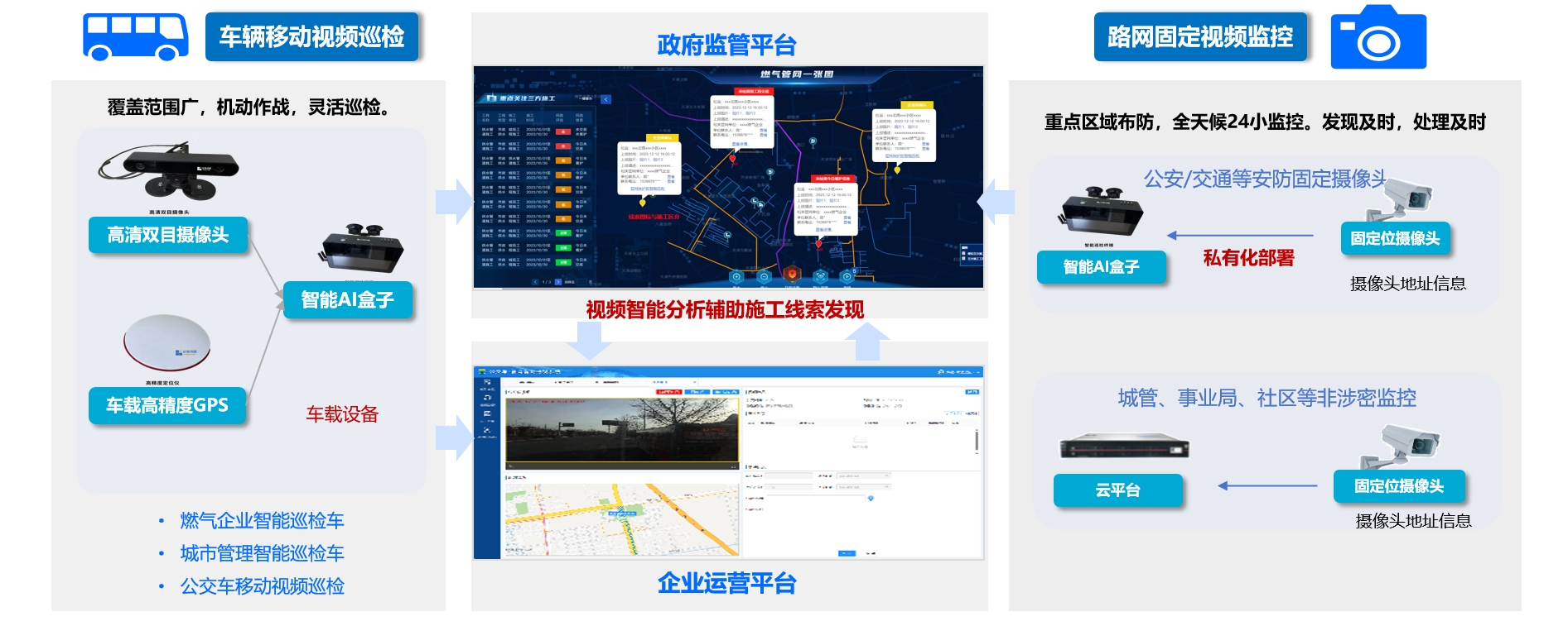 借助AI智能算法对挖掘作业、路面施工、工地围挡等三方施工场景进行自动辨识,解决第三方施工不报备、发现难的痛点问题,以及施工企业作业不合规、不规范的问题。