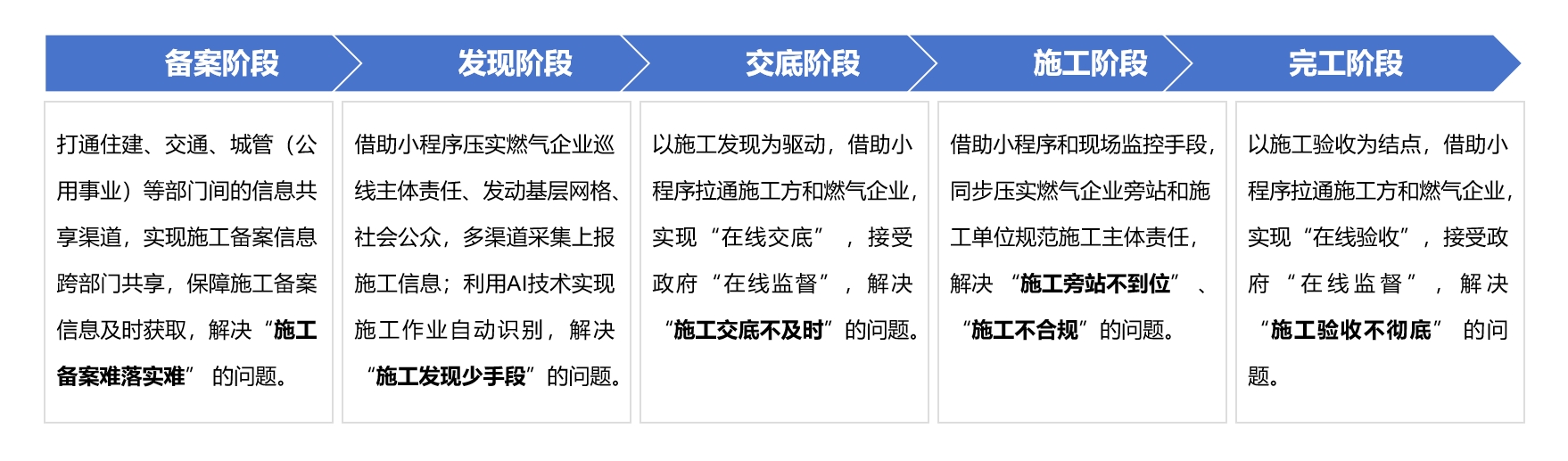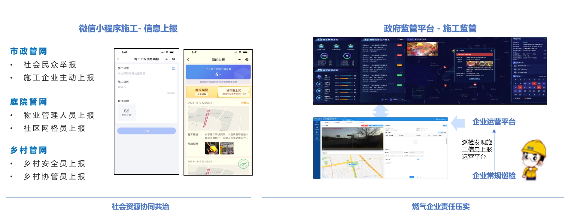 压实燃气企业责任,实现日常巡检过程中的施工信息及时上报,同时通过施工上报小程序,面向社区庭院、市政道路、和乡村等不同的场景,协同社区网格员、物业、施工单位、乡村安全员等实现社会层面的协同共治。