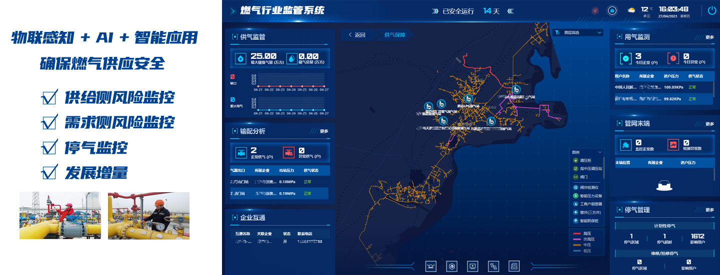 通过物联感知+智能应用,实现供给侧风险监控:生产连续性、稳定性、均衡性、安全储备能力、调配能力;实现需求侧风险监控:需求计划量、执行量实时监控,跟踪需求波动;因检修和异常事故等导致停气事件,对影响区域和恢复时间进行监控;根据城市发展规划和燃气供应增量计划,监督建设方和运营方进展;保障城市燃气供应安全,实现供需匹配。