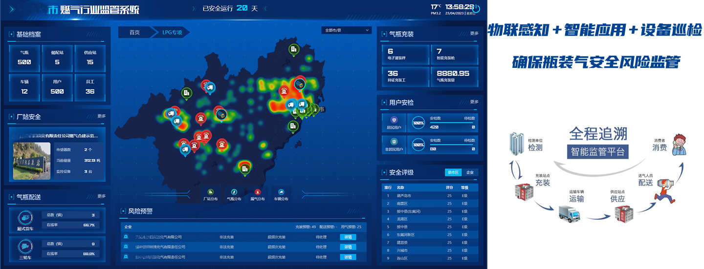 物联感知+智能应用+设备巡检,确保瓶装气安全风险监管。以云服务器为数据核心,建立起城市范围内钢瓶从生产制造、充装、检验、配送等全方位的安全监管网络平台;一瓶一码,一瓶一档,追踪溯源,解决了气瓶充装记录智能化、无纸化的技术难题;对瓶装气从站点灌输到装载运输搬运,再到最后的居民使用实现全流程监管与安全保障。