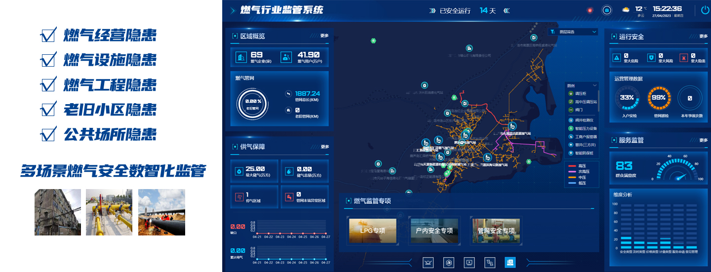 某市燃气企业在经营管理上存在着监管缺数据、物联成本高、事故救援难度大、事故后果严重等特点,仅凭传统安全风险管控手段,存在“看不住、管不全、管不好”的问题。新奥与住建局握手合作,瞄准建设综合实力一流的智能化燃气监管平台为目标,提升燃气安全生产及监管质量,促进人民生活幸福美好。