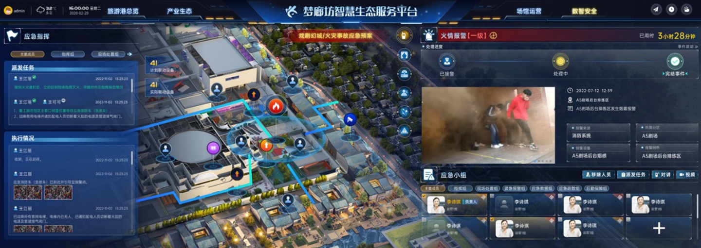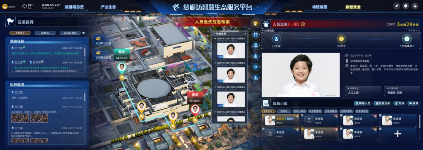 发生极端情况,如火灾造成的人员恐慌逃散随时可能发生踩踏,可启动智能预案,智能生成应急指挥组、智能派发任务、规划逃生路线、智能联动物联设施,如开启广播提醒、联动现场信息屏切换逃生引导模式、联动物联闸机开启通道等,快速将人员有序疏散出去,同时可在地图上实现一图通览掌控全局,使应急指挥调度更加切实有效。