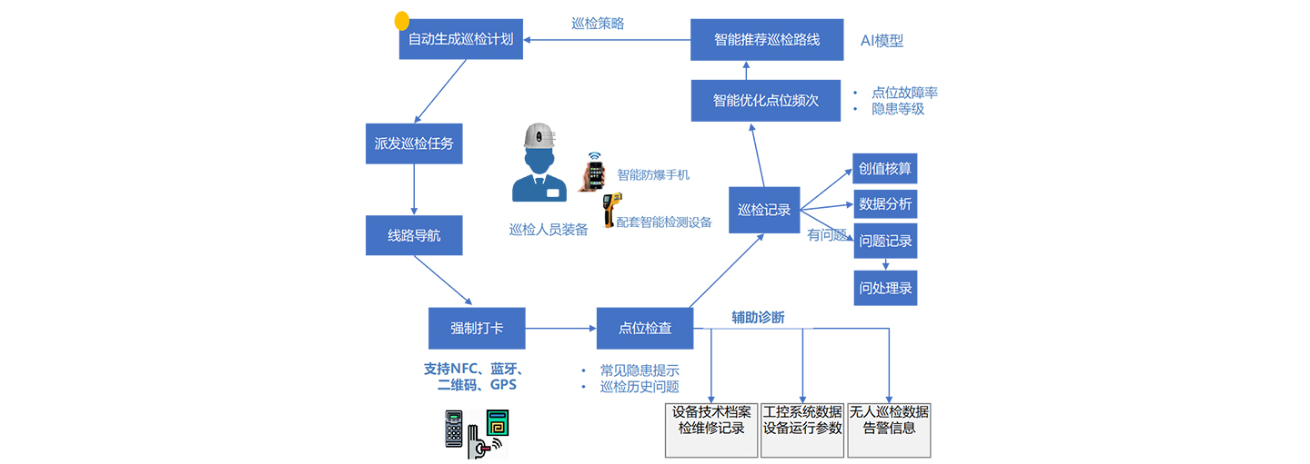 智能生成巡检计划,避免无效巡检、确保应检必检,降低劳动强度,提高效率;强制打卡,避免漏检;预测近期待完成的巡检任务;跟踪巡检中隐患、异常、故障、漏检情况,实现巡检结果的追溯;根据巡检结果数据的统计分析,系统确定重点巡检区域或者设备,调整巡检频率,优化巡检策略。