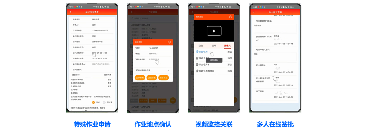 全过程电子化在线审批,支持主管领导手写签批,支持多人特殊作业审批,支持作业许可证在线打印,支持现场风险告知打印,支持现场移动视频监控。